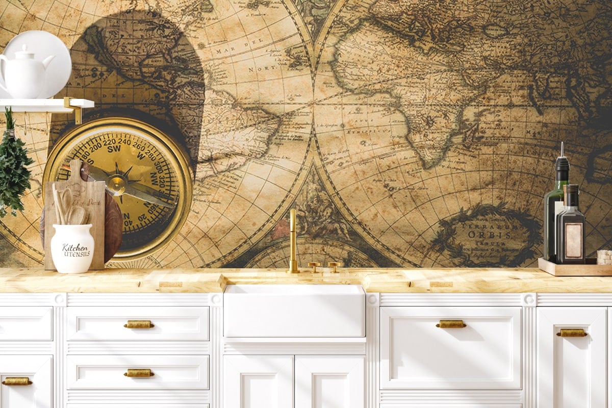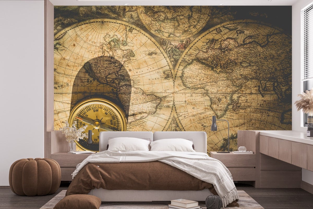Papier peint Panoramique Boussole Mappemonde sur mesure – facile à poser et sans colle