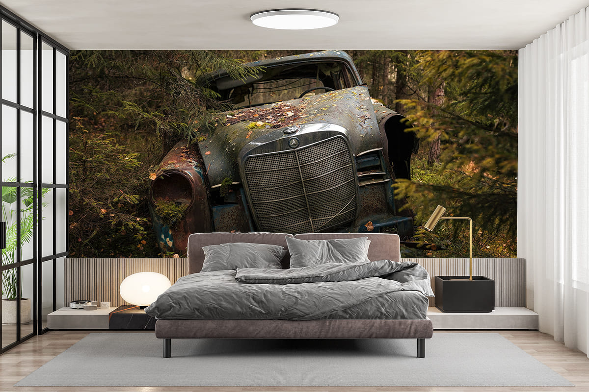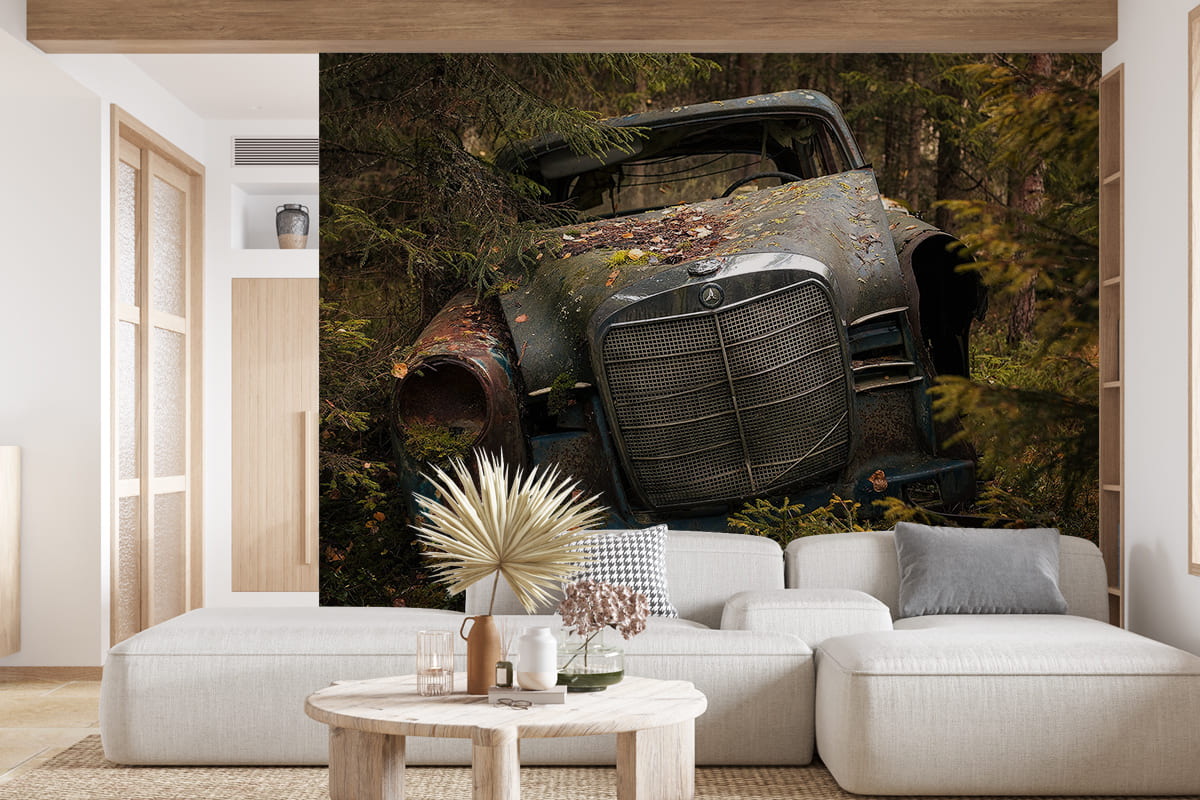 Papier peint Panoramique Epave Voiture Foret sur mesure – facile à poser et sans colle