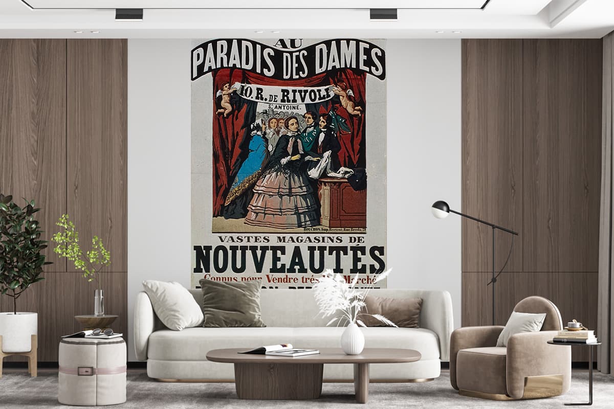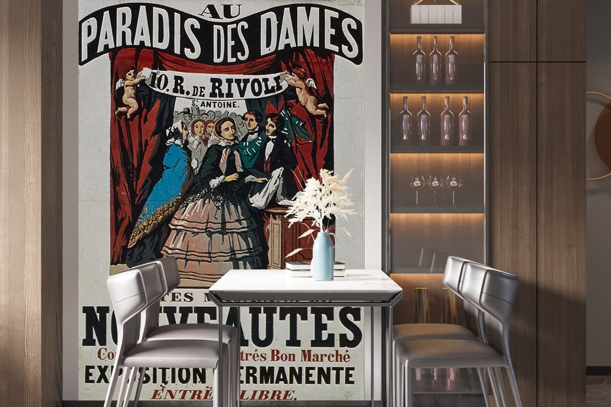 Offrez une seconde vie à vos murs avec un Papier Peint Panoramique Estampe Publicitaire - Au Paradis des Dames sur mesure, simple à poser, durable, et respectueux de l’environnement. C’est la solution idéale pour créer une ambiance unique, sans travaux compliqués ni matériel spécifique.