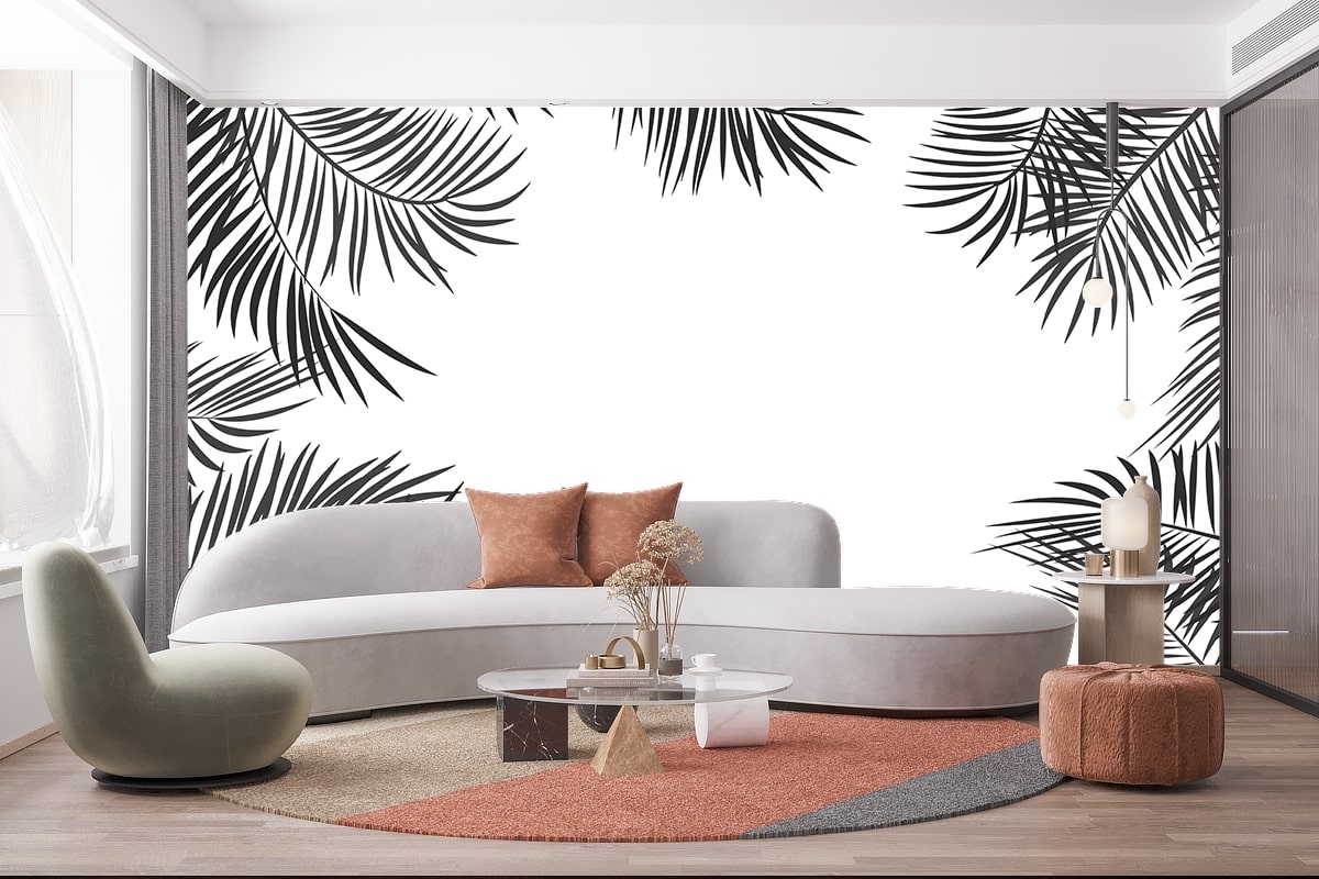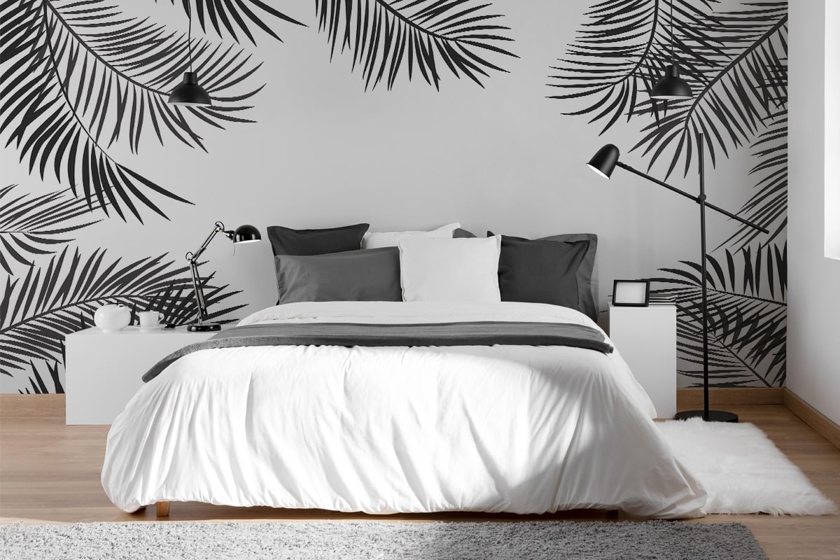 Papier Peint Panoramique Feuilles Palmier Noir et Blanc sur mesure – facile à poser et sans colle