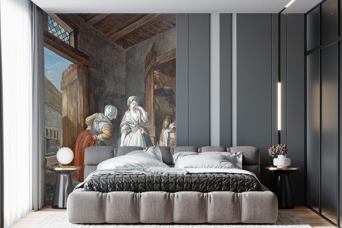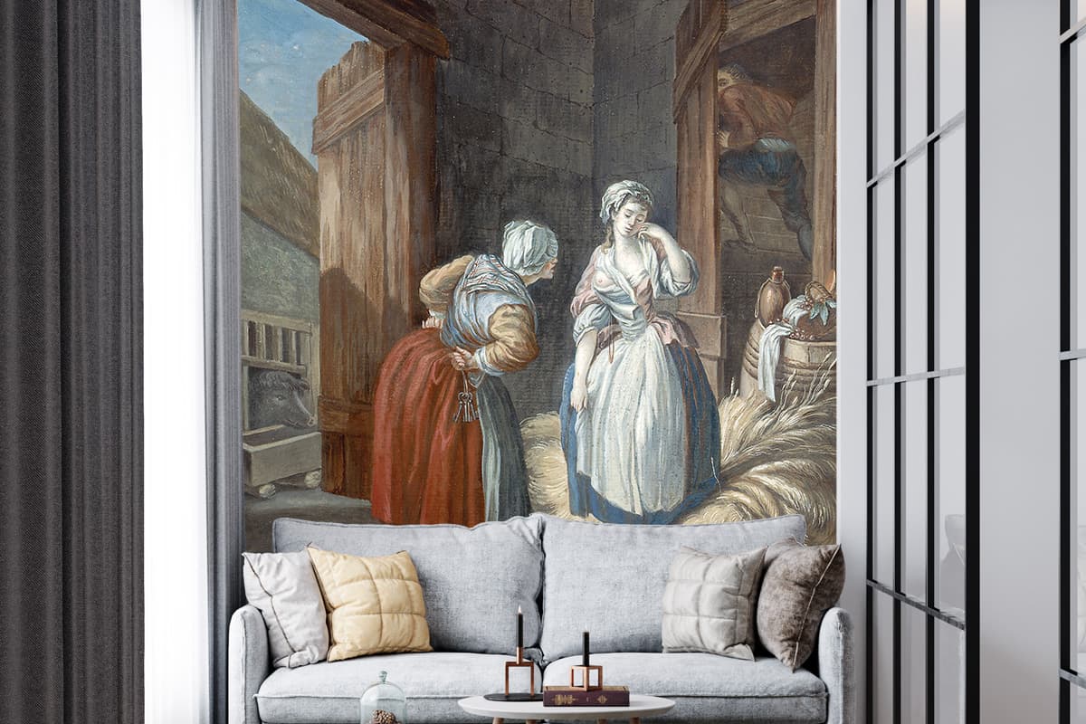 Tout ce qu’il faut pour poser facilement votre Papier Peint Panoramique Peinture 18e siècle Pierre-Antoine Baudouin - La Paysanne querellée par sa mère sans matériel supplémentaire.