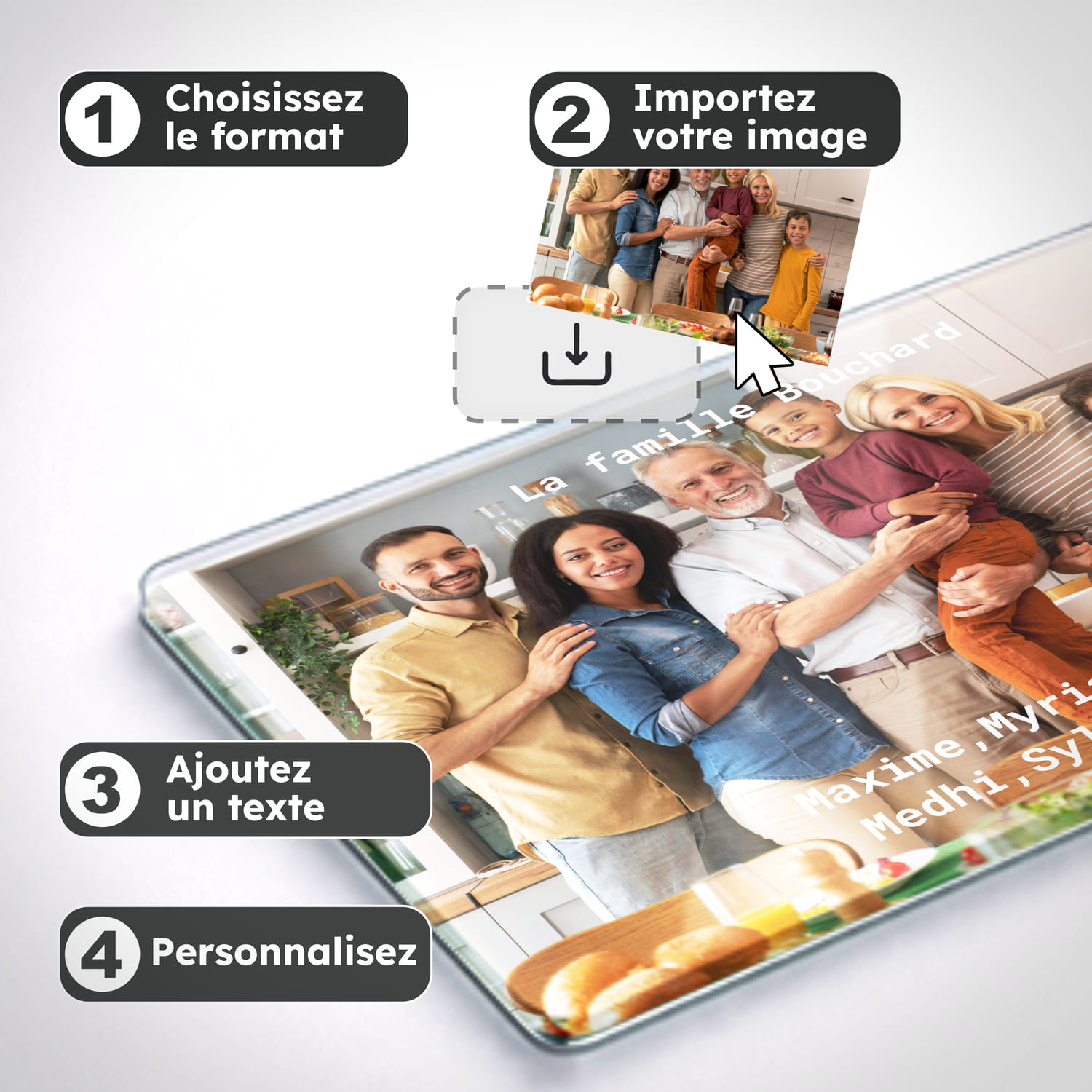 Créez votre plaque de porte personnalisée simplement en insérant la photo de votre famille, un dessin, une illustration ou tout autre visuel qui vous ressemble. Ajoutez les noms ou prénoms de votre foyer, une citation ou un message de bienvenue pour un rendu chaleureux et original.