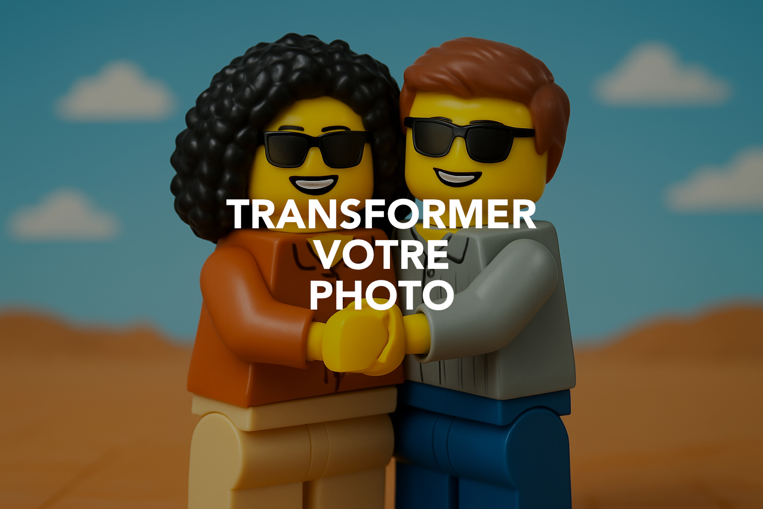 Transformez votre photo en portrait personnalisé façon figurine LEGO® et donnez à votre image un rendu ludique et original. Ce style s’inspire de l’univers des figurines en briques, avec des formes simples, des couleurs franches et un esprit résolument fun.