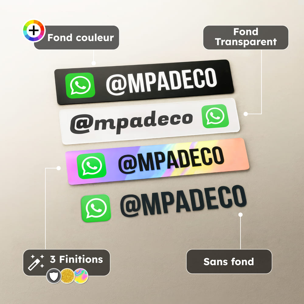 Si vous aimez ce genre de produit, vous devriez adorer notre Sticker Whatsapp personnalisé. Dans la même thématique, découvrez notre très populaire collection Lettrage adhésif personnalisé. Découvrez également notre collection Stickers personnalisés. Dans la même thématique, découvrez notre très populaire collection Lettrage réseaux sociaux.