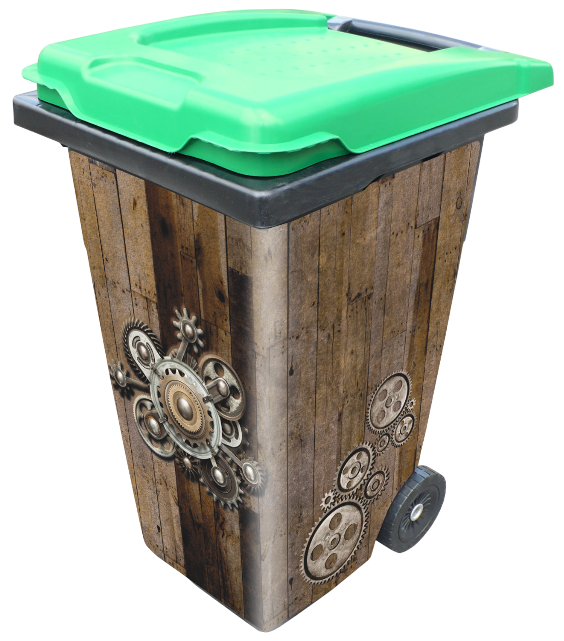 Nos modèles ont été conçus pour s'adapter à toutes les poubelles 120L et 180L standards et normées. Nul besoin de faire des découpes pour adapter le visuel ! Nos produits sont créés pour s'ajuster facilement aux poubelles. Vous pouvez choisir de commander seulement la face avant de la décoration rouage, ou de choisir le kit complet qui recouvrira totalement votre poubelle.